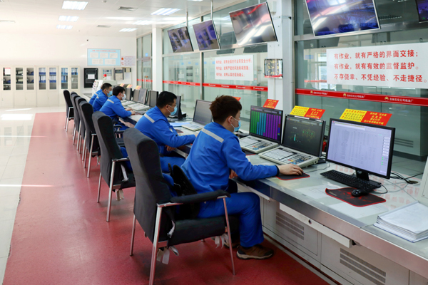 在厂内总控制室内,技术人员在监控生产情况。