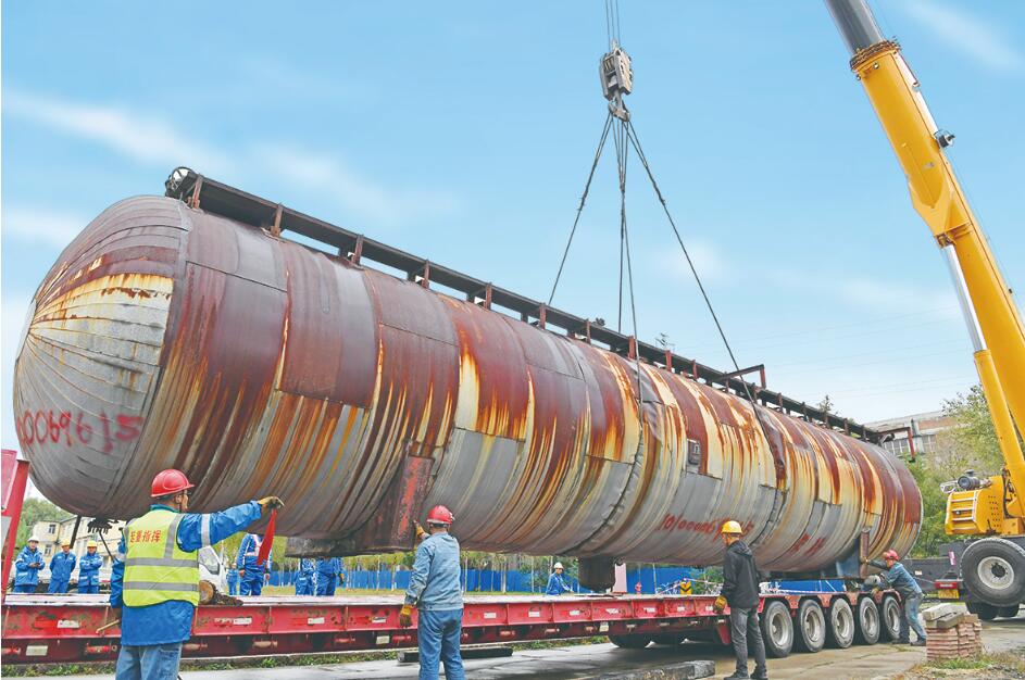 由于装置工艺改进需要,吉林石化决定对该贮罐进行拆除。吉林石化建修公司负责此次的拆卸吊运,为了将全长18米、直径超3米、重量达34吨的贮罐安全拆卸并运输到指定地点,技术人员制定施工方案,并先后进行3次施工桌面推演,提前对现场周围阻碍吊运的管廊、管线、阀门进行拆卸清理,用最短时间安全完成此次拆卸吊运任务。