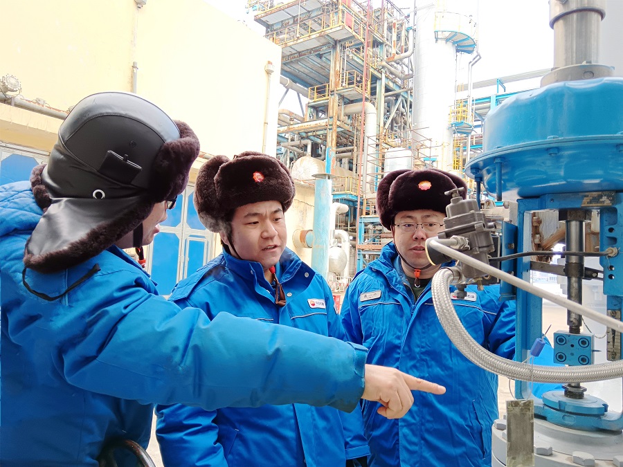 吉林石化乙烯厂专业技术人员在装置现场共同研究2025年提质增效可行性措施。
