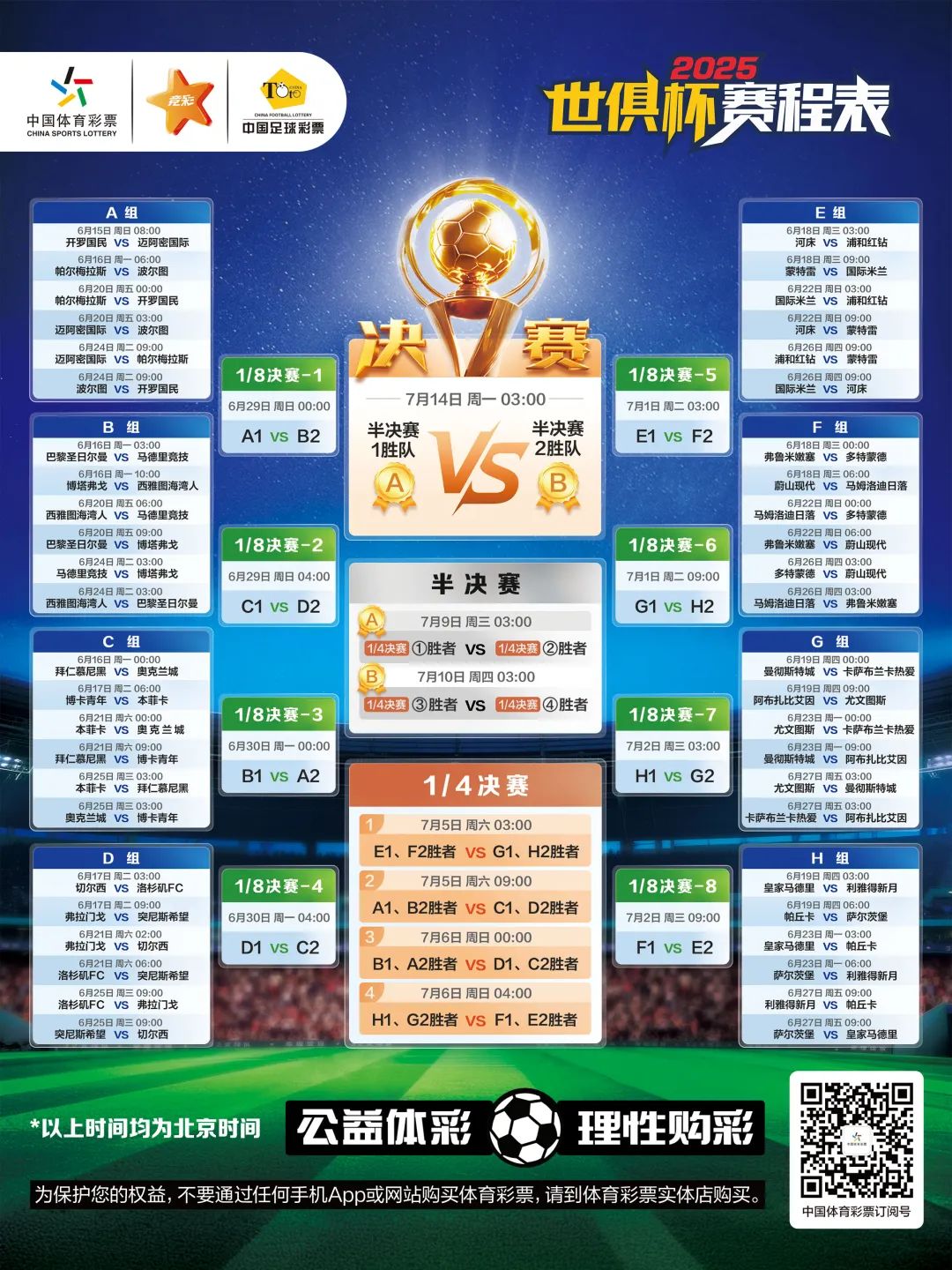 北京时间6月15日至7月14日,2025年国际足联俱乐部世界杯(以下简称“世俱杯”)将激情上演,作为今年国际足坛的重头戏,广大球迷们摩拳擦掌,期待能为喜爱的球队加油助威,也有球迷朋友希望通过购买竞猜型彩票获得一份参与感。然而正是这样的时候,我们更应该以理性的态度参与赛事竞猜,在享受世俱杯带来乐趣的同时,也为国家体育事业和公益事业做出一份贡献。