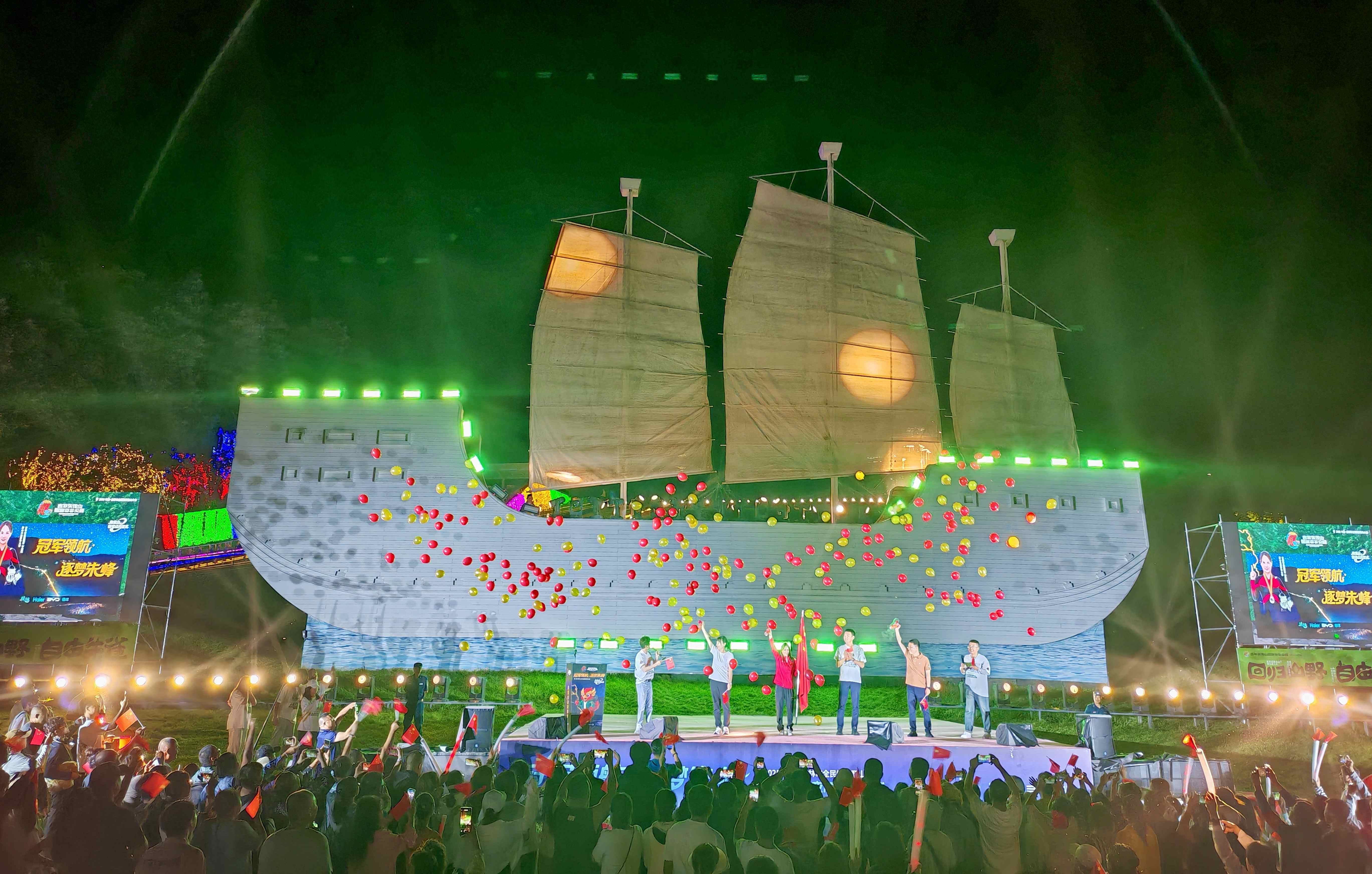 《我和我的祖国》旋律响起,众人高声合唱。红旗的鲜红、荧光棒的闪烁、星空的璀璨和歌声交融。