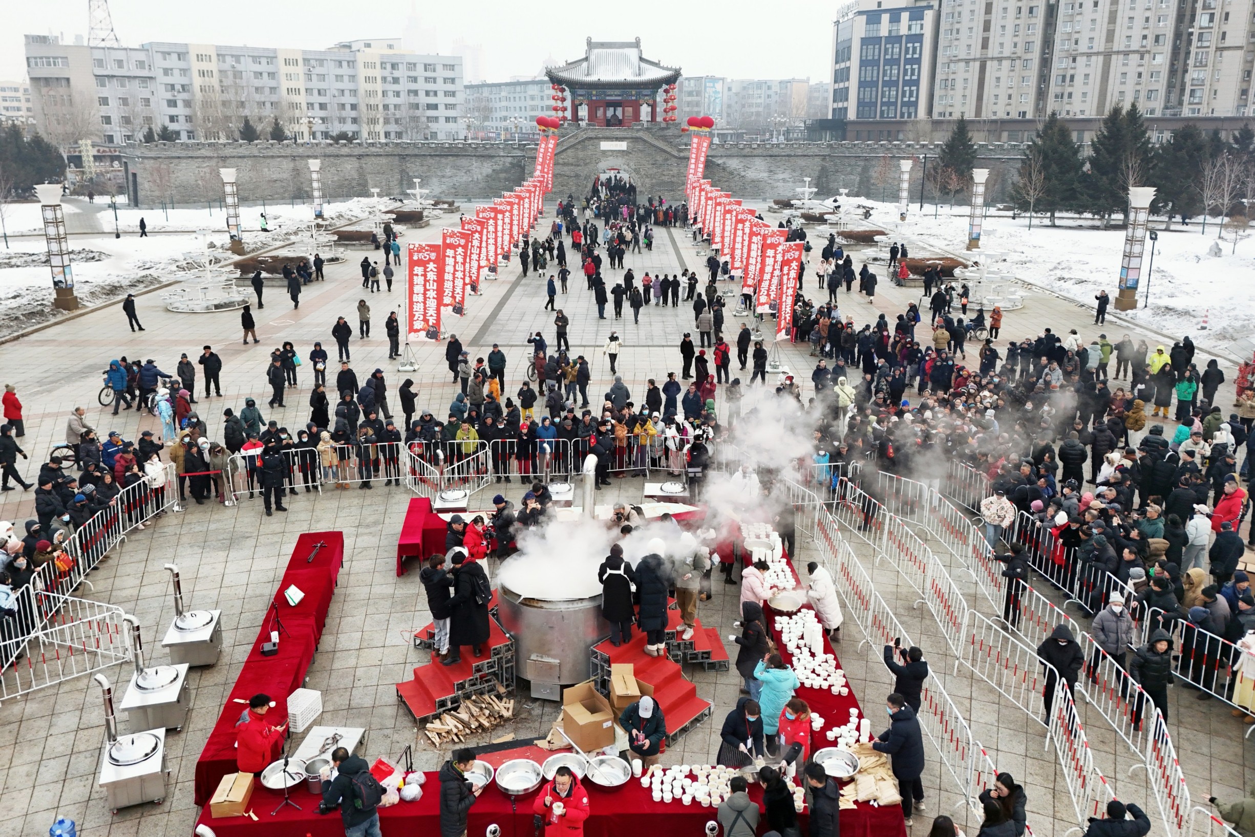 2月4日上午,天气微凉,北山风景区人民广场上的游客陆续多了起来。一口直径两米的大锅架设在广场中央,柴火噼啪作响,锅中热气蒸腾,浓郁的杀猪菜香气随风弥漫,吸引着往来市民驻足询问、排队等候。上午9时,等待免费品尝的队伍已从锅旁一路延伸,穿过广场,直至不远处的德胜门城墙脚下。