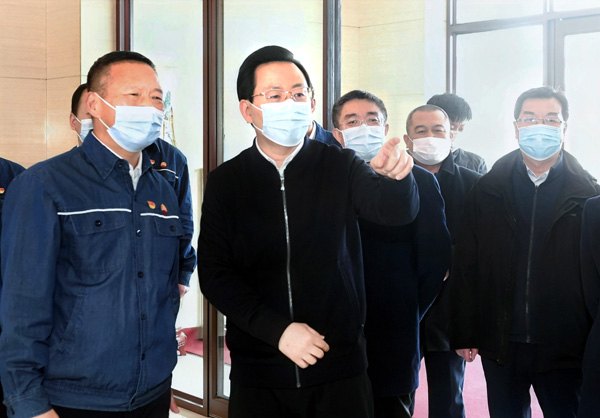 市委书记胡斌(左二)在中石油吉林市销售分公司,实地察看大型批发类企业经营情况。