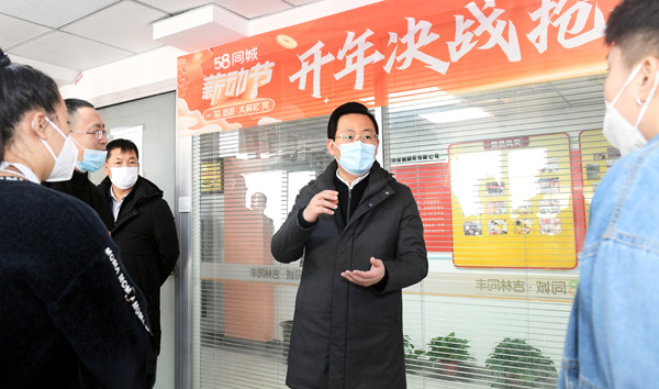 市委书记胡斌(中)在急时雨家庭服务有限公司,实地察看重点规上服务业企业经营情况。