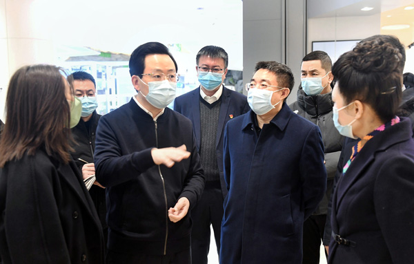 市委书记胡斌(左三)在欧亚综合体,实地察看大型综合百货类企业经营情况。