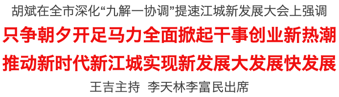 2月19日,我市召开深化“九解一协调”提速江城新发展大会。市委书记胡斌在会上强调,要深入贯彻习近平总书记在新时代推动东北全面振兴座谈会上的重要讲话精神,认真落实全省优化营商环境加快项目建设大会要求,即刻进入状态,马上行动起来,只争朝夕、开足马力,深化“九解一协调”,全面掀起干事创业新热潮,推动新时代新江城实现新发展、大发展、快发展。市长王吉主持会议。市人大常委会主任李天林、市政协主席李富民出席会议。