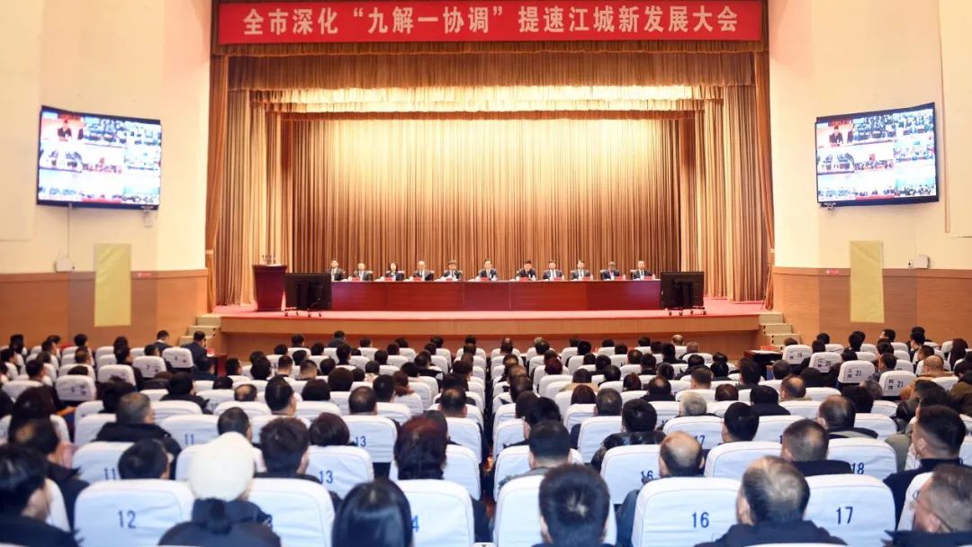 图为全市深化“九解一协调”提速江城新发展大会会场。