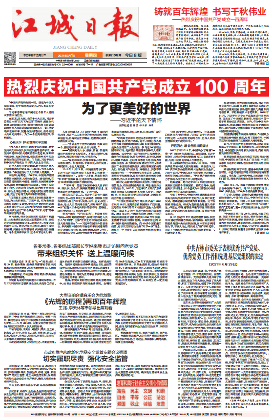 2021年,江城日报在习近平新时代中国特色社会主义思想指导下,深入贯彻落实党的十九大和十九届历次全会精神,积极宣传党的基本理论、基本路线、基本方略,认真履行围绕中心、服务大局基本职责,认真落实意识形态工作责任制,坚持做好庆祝中国共产党成立100周年系列报道,开设“奋斗百年路 启航新征程”系列专栏、专题、专版,重点刊发新华社、人民日报相关稿件,策划开展“初心·百年:吉林大地的追寻”主题采访活动,推出100多个彩色专版,江城晚报、吉林乌拉圈智慧客户端、松花江网同步联动,成功营造出了共庆百年华诞、齐心协力开创振兴发展新局面的浓厚氛围,得到了吉林省委宣传部传媒监管处主办《吉林报纸审读》的高度评价;聚焦落实“四六四五”发展战略、生态城市建设、营商环境建设、冰雪旅游、产业链招商、乡村振兴、县域经济突破等重点工作,开设30余个专栏;克服困难承担乡村振兴、“四联四促”包保、产业链招商等工作,得到了社会各界认可。