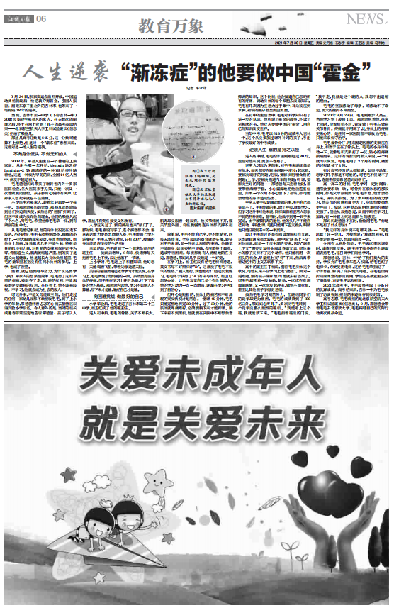▲2021年7月30日,《江城日报》6版刊发吉林市第一中学的“中国霍金”——邢益凡的人生逆袭故事