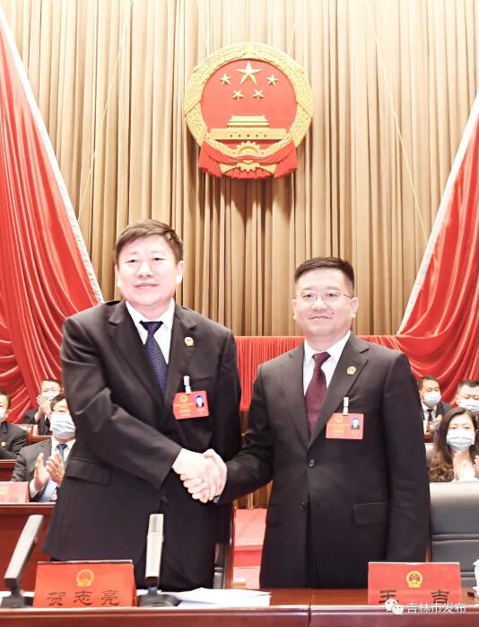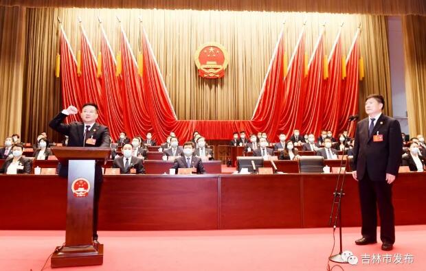 当选市长王吉进行宪法宣誓,贺志亮监誓。贺志亮代表市委和大会主席团对王吉同志当选市长表示热烈祝贺。希望王吉市长不负重托,团结带领政府一班人凝心聚力、真抓实干,不断开创吉林市振兴发展新局面。