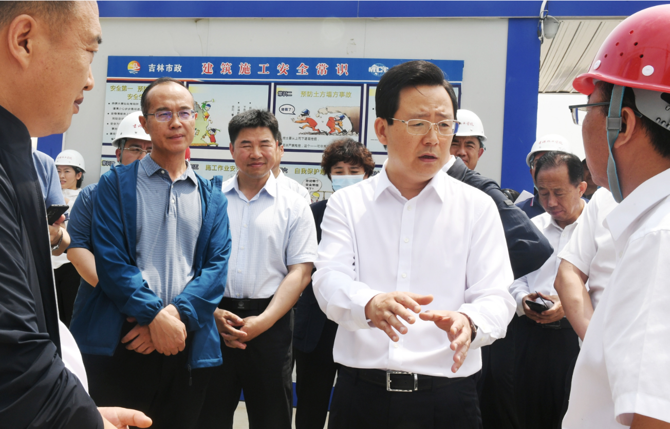 市委书记胡斌(前右二)在吉林化工学院丰满校区项目地察看项目进展情况。