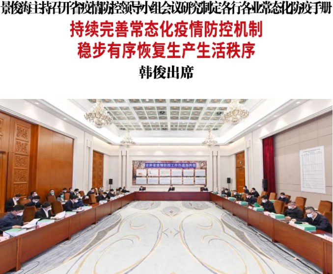 今天,省委书记景俊海以视频形式主持召开省疫情防控领导小组会议,研究制定各行各业常态化防疫手册。他强调,要深入贯彻习近平总书记关于统筹疫情防控和经济社会发展的重要讲话重要指示精神,按照孙春兰副总理部署要求,坚持科学精准、真抓实干,持续完善常态化疫情防控机制,全面提升监测预警和应急反应能力,不断夯实疫情防控防线,稳步有序恢复生产生活秩序。省委副书记、省长韩俊出席会议。