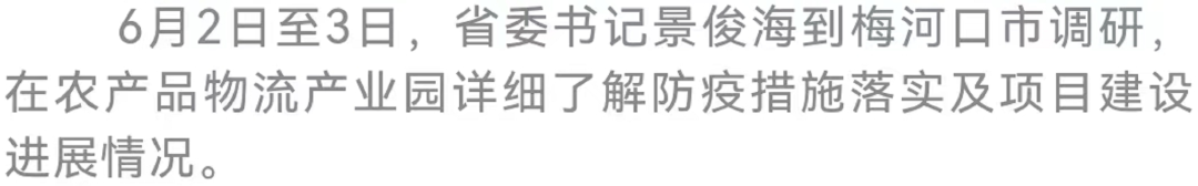 6月2日至3日,省委书记景俊海到梅河口市调研。他强调,要深入贯彻习近平总书记关于高效统筹疫情防控和经济社会发展的重要讲话重要指示精神,抓细抓实常态化防控,全力稳住经济基本盘,为实现“止跌、回升、增长”目标提供有力支撑。