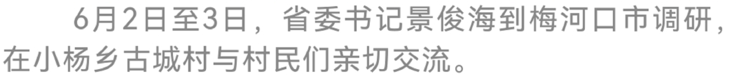 正值传统节日端午节,小杨乡古城村正在进行朝鲜族传统民俗活动。村民们载歌载舞,表达过上幸福生活的喜悦心情。景俊海与大家亲切交流,致以节日问候,鼓励当地因地制宜开展乡村游、民俗游,让田园美、山水美、民俗美、生态美的农村变成人人向往的地方。在人民公园,看到许多市民正在休闲散步、放松身心,景俊海要求梅河口牢固树立精心、精益、精致的理念,努力创造宜业、宜居、宜乐、宜游良好环境,更好满足人民对美好生活的向往。