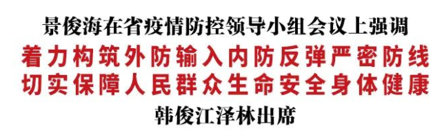 7月8日,省委书记景俊海以视频形式主持召开省疫情防控领导小组会议,深入贯彻习近平总书记在湖北武汉考察时的重要讲话精神,听取国务院联防联控机制《新型冠状病毒肺炎防控方案(第九版)》实施情况,针对奥密克戎变异毒株传播特点,研究部署下一步防控措施。景俊海强调,要深刻领会习近平总书记关于高效统筹疫情防控和经济社会发展的重要讲话重要指示精神,始终坚持人民至上、生命至上,坚持科学精准、动态清零,毫不松懈抓好常态化疫情防控,着力构筑外防输入、内防反弹严密防线,切实保障人民群众生命安全和身体健康。省委副书记、省长韩俊,省政协主席江泽林出席会议。