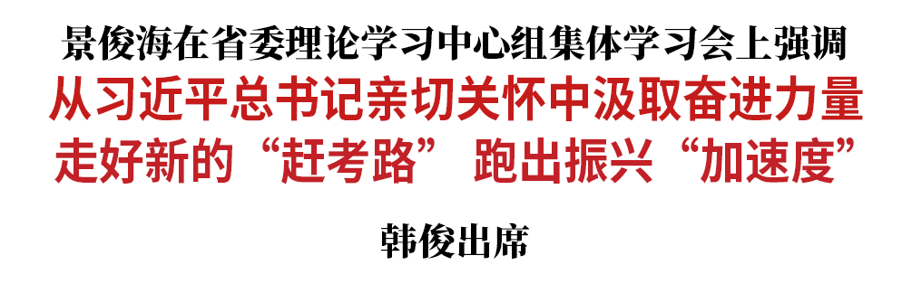 7月14日,省委书记景俊海主持召开省委理论学习中心组集体学习会,重温学习、深入贯彻习近平总书记视察吉林重要讲话重要指示精神,持之以恒动员全省上下牢记嘱托、感恩奋进,奋力谱写全面建设社会主义现代化新吉林精彩篇章。景俊海强调,要从习近平总书记亲切关怀中汲取奋进力量,坚决扛起“新担当、新突破、新作为”重大职责使命,走好新的“赶考路”、跑出振兴“加速度”,以实际行动迎接党的二十大胜利召开。省委副书记、省长韩俊出席会议。