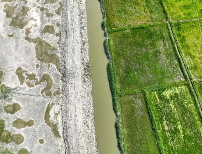 镇赉县稻田(右)与盐碱滩涂一处交界(2022年7月12日摄,无人机照片)。潘晟昱 摄