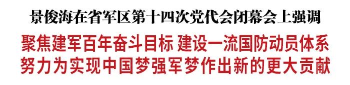 今天,吉林省军区第十四次党代会在长春胜利闭幕。省委书记、省军区党委第一书记景俊海出席闭幕会并讲话。他强调,要坚持以习近平新时代中国特色社会主义思想为指导,深入贯彻习近平强军思想,认真落实新时代军事战略方针,坚持党对人民军队的绝对领导,坚持政治建军、改革强军、科技强军、人才强军、依法治军,聚焦建军百年奋斗目标,建设一流国防动员体系,努力为实现中国梦、强军梦作出新的更大贡献。