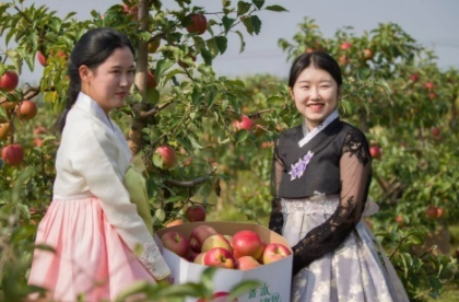 10月1日,记者来到吉林省延边朝鲜族自治州珲春市板石镇孟岭村。这里正在举办苹果采摘节。欢乐的人们载歌载舞,收获丰收果实,共庆祖国生日。