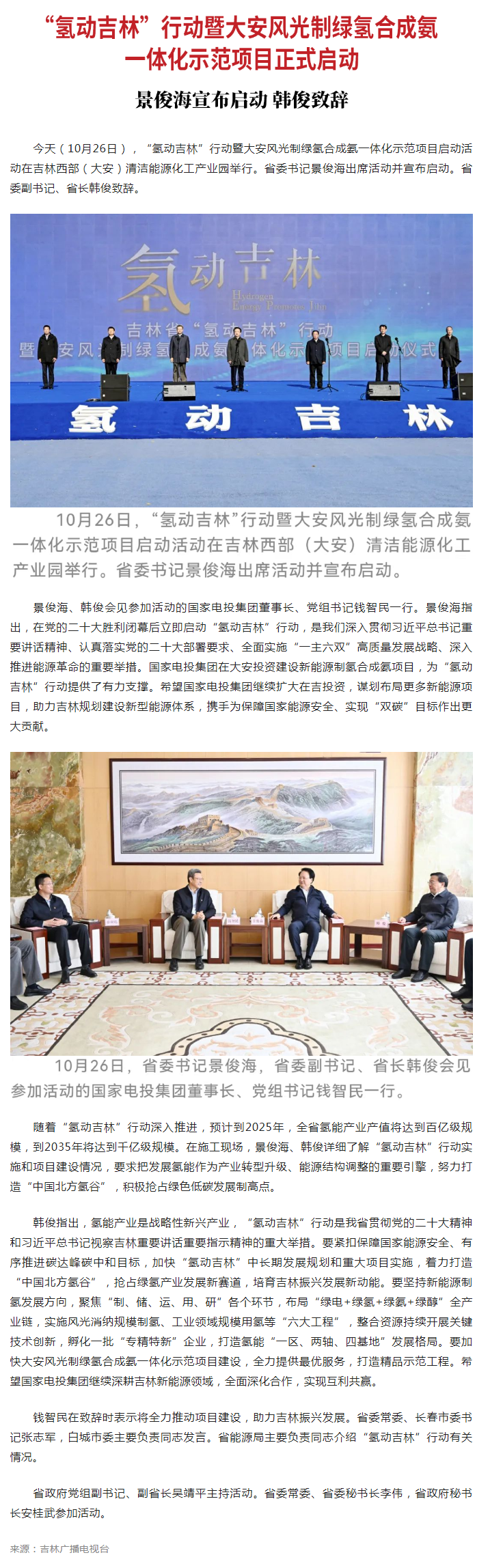 原标题: “氢动吉林”行动暨大安风光制绿氢合成氨一体化示范项目正式启动