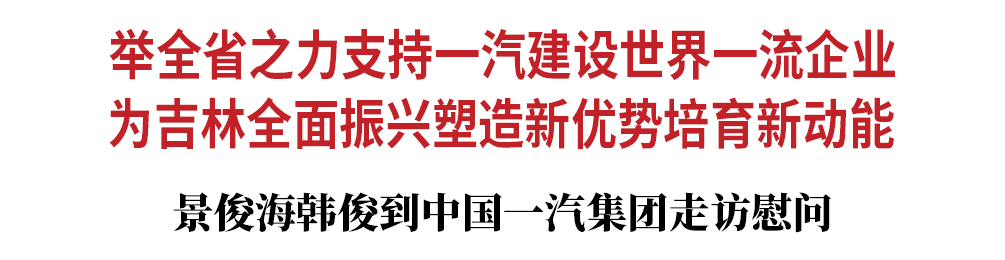 景俊海说,一汽是吉林最有含金量、最具代表性、最值得骄傲的名片。希望一汽牢记习近平总书记殷殷嘱托,牢牢掌控关键核心技术,加快建设世界一流企业,助力吉林全面振兴取得新突破。要当好吉林全面振兴的顶梁柱,持续深化与大众、奥迪、丰田等国际伙伴的战略合作,夯实排产计划,稳步扩大销售,努力实现全年目标。要当好全省转型升级的排头兵,聚焦汽车产业“新四化”发展趋势,进一步完善全球研发布局,集中开展汽车产业核心技术攻关,加快推动奥迪一汽新能源汽车、红旗新能源新工厂等项目建设,强势抢占新能源汽车赛道和未来产业发展制高点。要当好全省产业集聚的风向标,推动资源向吉林汇集、产业向吉林聚集、人才向吉林云集,加快形成门类齐全、健全完善的上下游产业配套体系,形成具有国际竞争力的完整汽车产业链条,进一步提升吉林汽车产业发展整体优势。要当好吉林发展形象的代言人,大力实施民族品牌发展战略,在理念、产品、技术、服务等方面推陈出新,推动品牌高端化、顶级化、新锐化,让“红旗”高高飘扬、“解放”持续领航、“奔腾”澎湃前行,成为吉林高端制造的优秀代表。省委将大力实施汽车产业集群“上台阶”工程,举全省之力支持一汽建设世界一流企业,为一汽提供贴心、暖心、细心服务,为一汽创新发展营造一流环境。长春市要以建设世界一流的国际汽车城为抓手,帮助一汽破解生产经营中遇到的实际问题,推动一汽在新时代民族汽车工业发展中再立新功、再创辉煌。