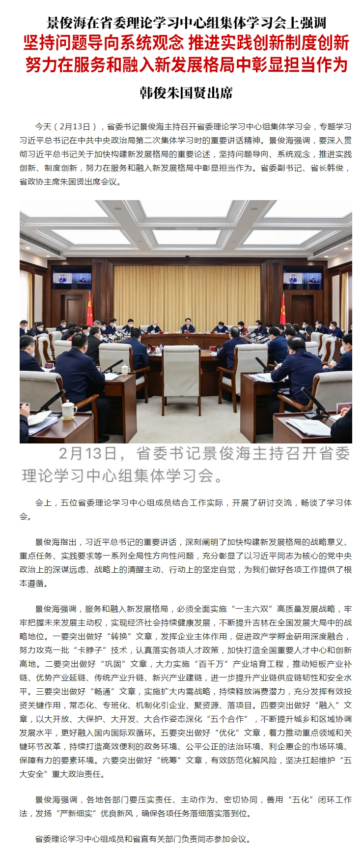 原标题: 景俊海:坚持问题导向系统观念 推进实践创新制度创新 努力在服务和融入新发展格局中彰显担当作为