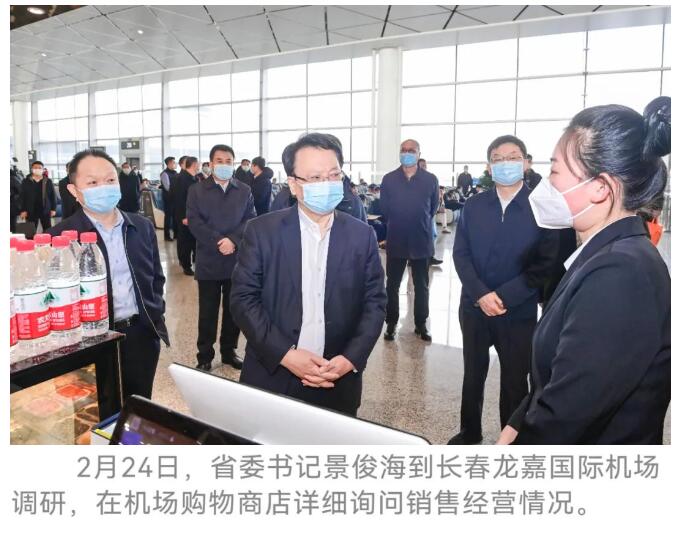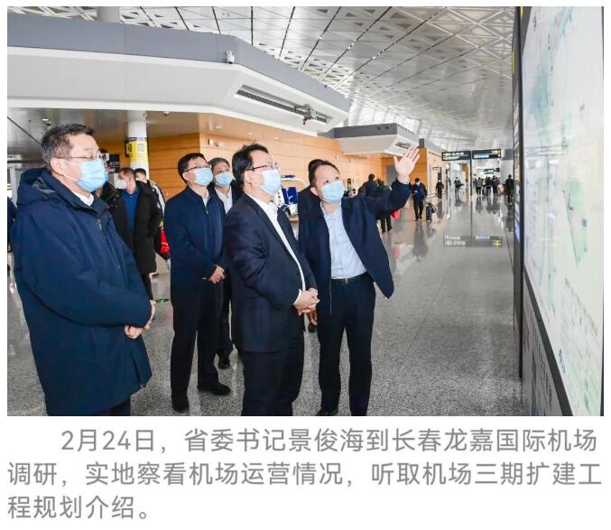 2月24日,省委书记景俊海到长春龙嘉国际机场调研。他强调,要深入贯彻习近平总书记视察吉林重要讲话重要指示精神,紧密结合全面实施“一主六双”高质量发展战略,高标准高质量推进长春龙嘉国际机场三期扩建工程,进一步提升航空运力、建设航空枢纽,精益求精打造展示吉林形象重要窗口。