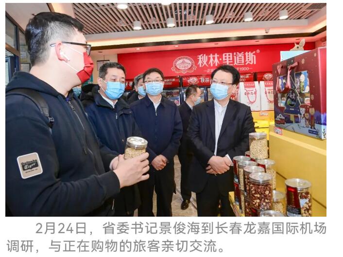 景俊海走进正在营业的机场购物商店,详细询问销售经营情况,叮嘱商家诚信经营、真情服务,多引进具有吉林地域特色的优质商品,更好宣传推介吉林。景俊海与正在购物的旅客亲切交流,了解到这位旅客与朋友们刚刚在吉林度过了十分快乐的滑雪假期,景俊海热情相邀,吉林是冰雪旅游胜地、避暑休闲天堂,欢迎大家常来吉林做客游玩。