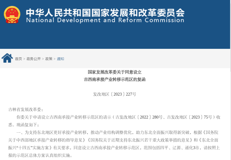 3月15日,国家发改委发布《关于同意设立吉西南承接产业转移示范区的复函》,同意设立吉西南承接产业转移示范区,范围包括四平、辽源、通化3市。
