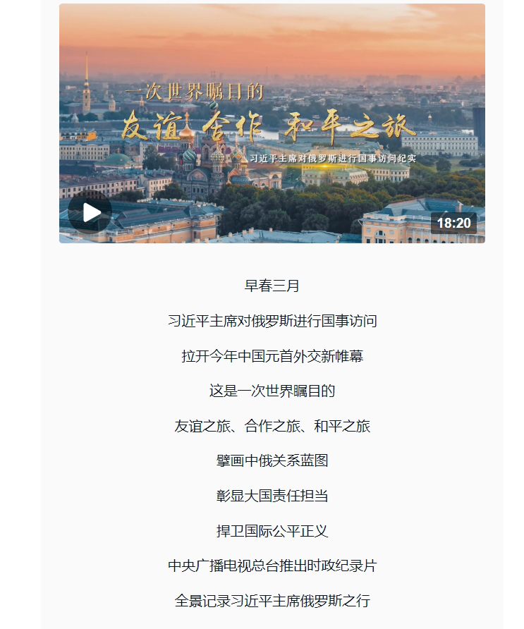 原标题: 时政纪录片丨一次世界瞩目的友谊、合作、和平之旅——习近平主席对俄罗斯进行国事访问纪实