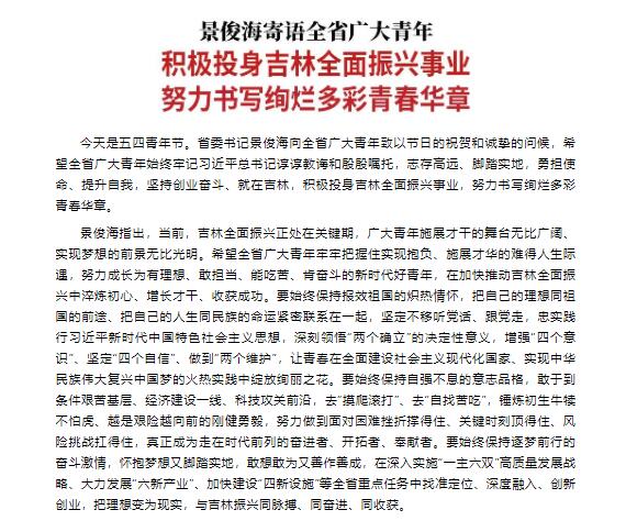原标题: 景俊海寄语全省广大青年 积极投身吉林全面振兴事业 努力书写绚烂多彩青春华章