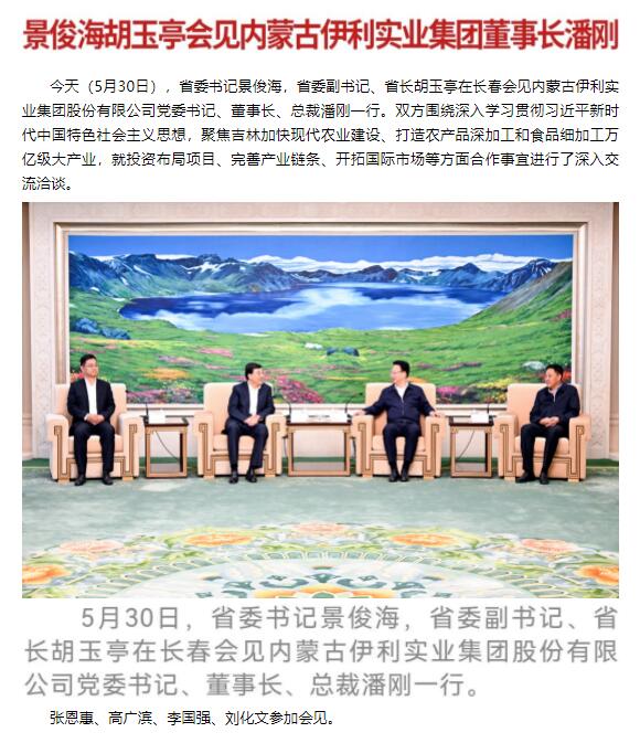 原标题: 景俊海胡玉亭会见内蒙古伊利实业集团董事长潘刚