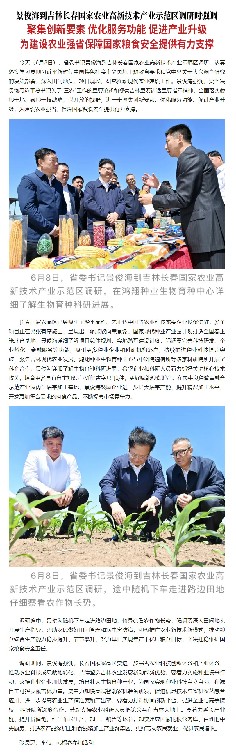 景俊海:聚集创新要素 优化服务功能 促进产业升级 为建设农业强省保障国家粮食安全提供有力支撑
