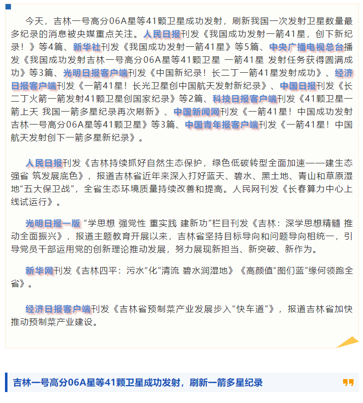央媒眼中的吉林丨吉林一号高分06A星等41颗卫星成功发射获央媒关注