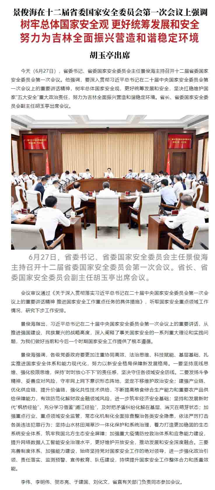 原标题: 景俊海:树牢总体国家安全观 更好统筹发展和安全 努力为吉林全面振兴营造和谐稳定环境