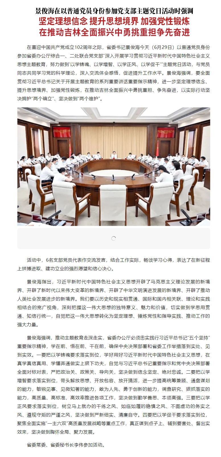 原标题: 景俊海:坚定理想信念 提升思想境界 加强党性锻炼 在推动吉林全面振兴中勇挑重担争先奋进