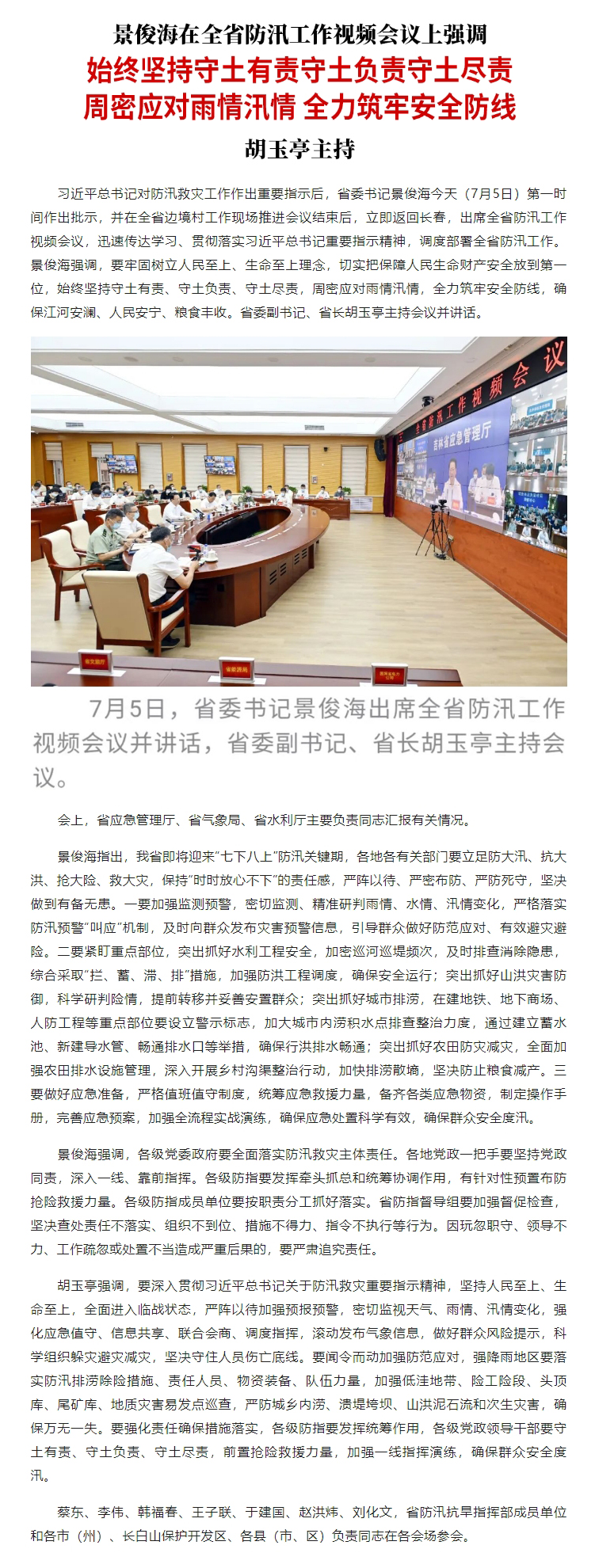 原标题: 景俊海:始终坚持守土有责守土负责守土尽责 周密应对雨情汛情 全力筑牢安全防线