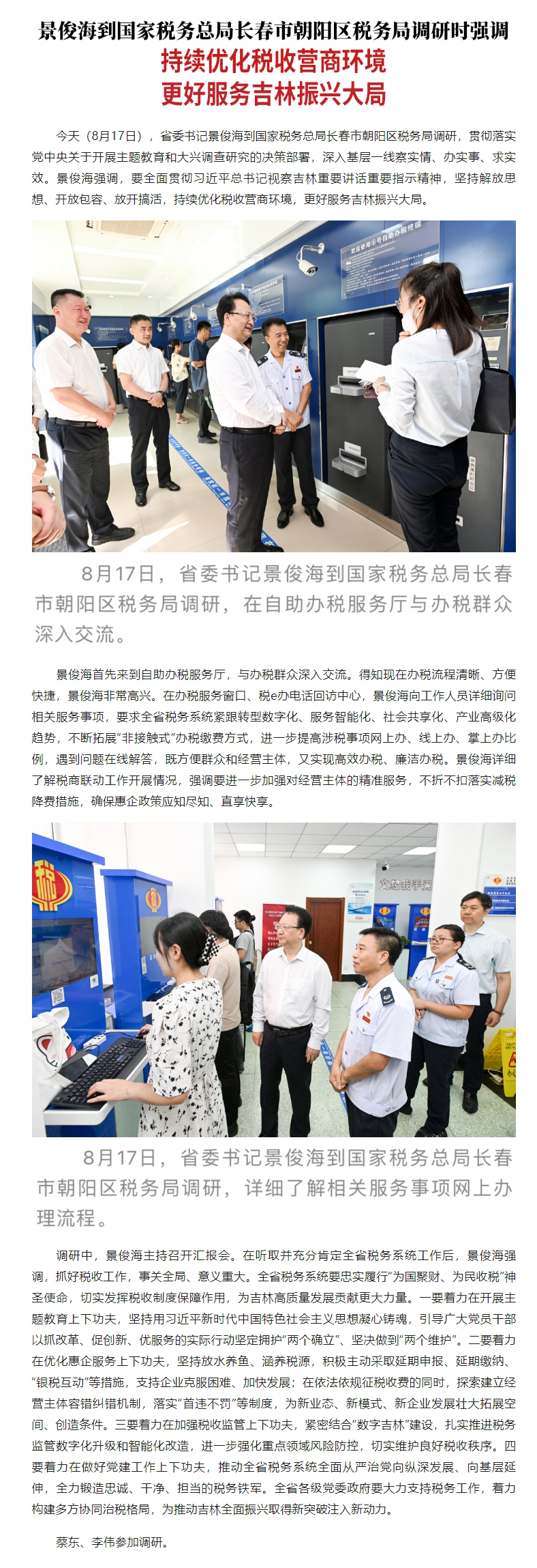 原标题: 景俊海:持续优化税收营商环境 更好服务吉林振兴大局