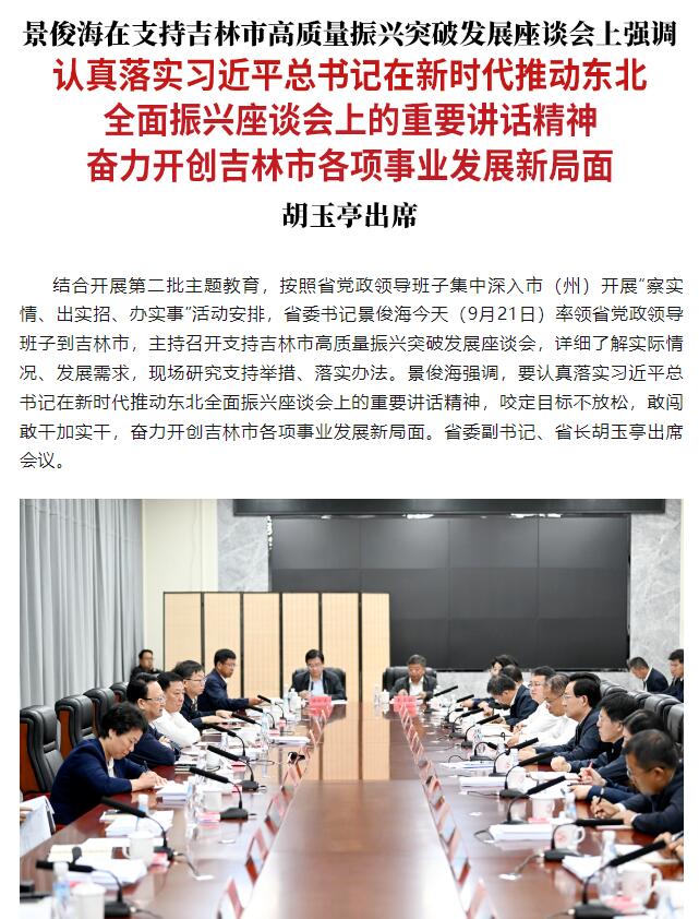 原标题: 景俊海:认真落实习近平总书记在新时代推动东北全面振兴座谈会上的重要讲话精神 奋力开创吉林市各项事业发展新局面