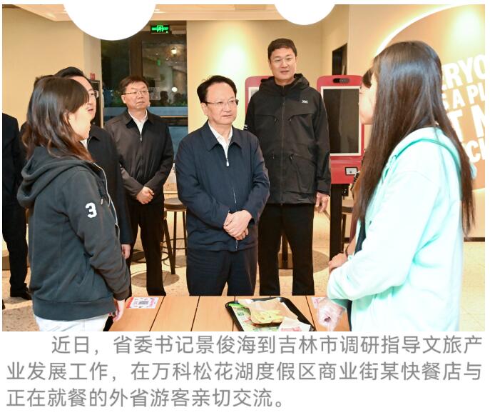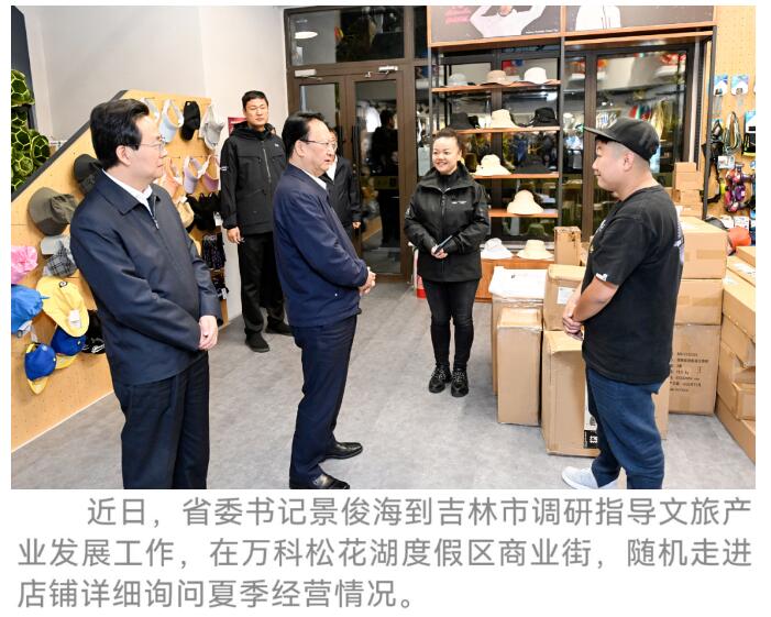 今年夏季,万科松花湖度假区举办了多项文体活动,吸引了大量游客前来避暑休闲。在度假区商业街,许多主营滑雪装备的商店正在销售户外和露营用品。景俊海随机走进几家店铺,详细询问夏季经营情况,鼓励商家抓住吉林四季旅游规模持续增长的新机遇,进一步丰富适应季节特点的产品线,更好满足游客多层次需求。在商业街一家快餐店,景俊海与正在就餐的外省游客亲切交流,他说,吉林省是全国著名的避暑天堂、滑雪胜地,一年四季风光各异、景色怡人,欢迎你们常带朋友到吉林各地游览美景、享用美食。