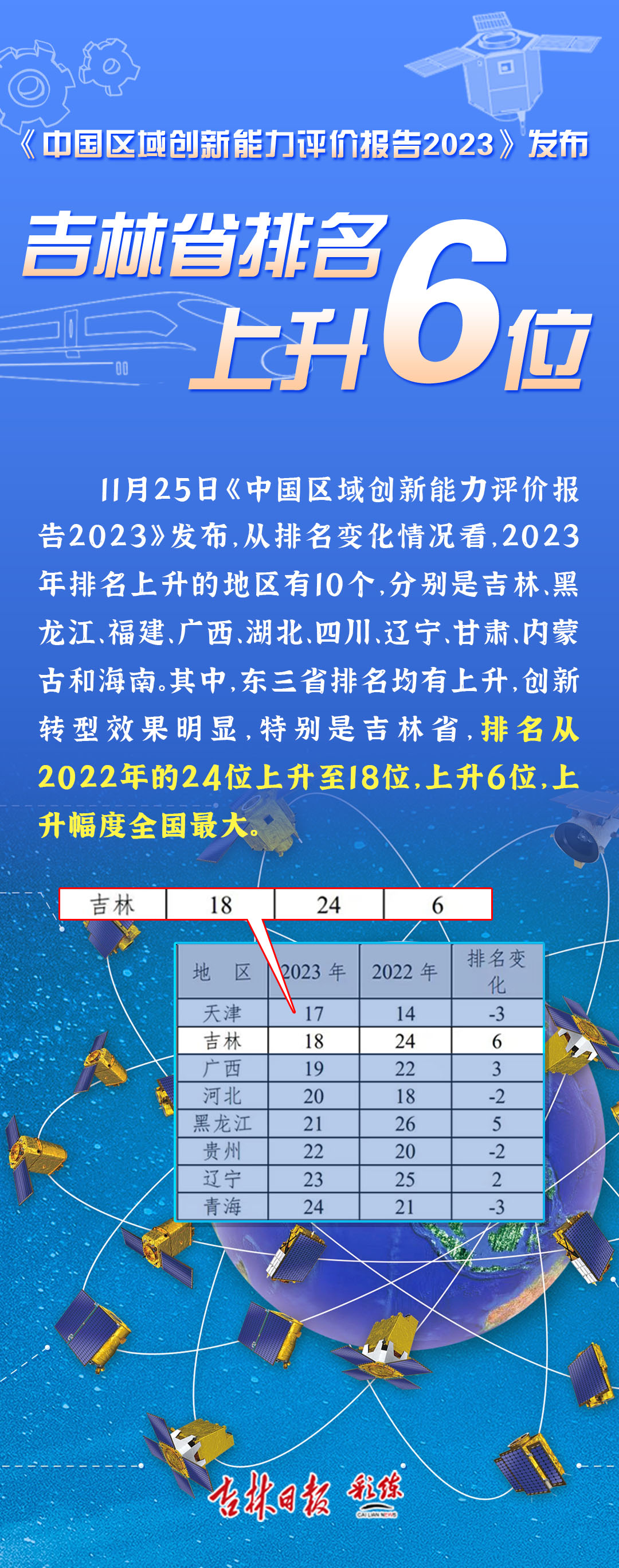 11月25日,《中国区域创新能力评价报告2023》发布,吉林省排名从2022年的24位上升至18位。