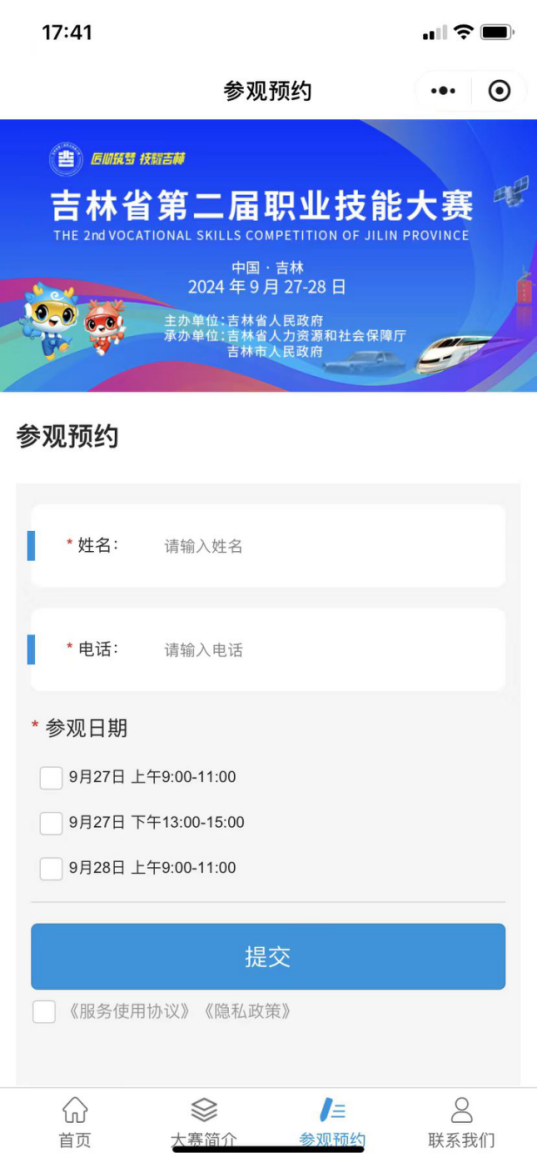 为方便公众参观,自9月20日起,预约参观通道正式开启。您只需登录微信“吉林省第二届职业技能大赛”小程序,点击“参观预约”按钮,输入姓名和手机号,选择相应的参观日期,完成预约,凭二维码电子凭证即可进行参观。