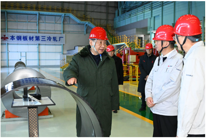 2025年1月22日至24日,中共中央总书记、国家主席、中央军委主席习近平冒着严寒来到辽宁,看望慰问基层干部群众。这是23日下午,习近平在本溪市考察本钢板材冷轧总厂第三冷轧厂车间。新华社记者 谢环驰 摄