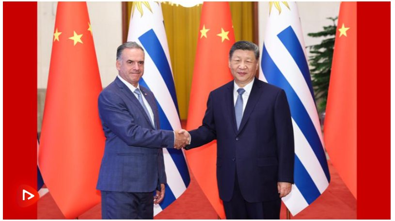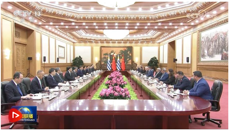 习近平指出,当今世界正处于百年未有之大变局,国际形势变乱交织,单边霸凌愈演愈烈,中方支持乌拉圭接任“77国集团和中国”轮值主席国,愿与乌方加强全球南方团结协作,共同推进平等有序的世界多极化、普惠包容的经济全球化,携手并进、共谋发展,为构建人类命运共同体作出更大贡献。中方始终重视中拉关系,支持拉美和加勒比国家维护自身主权、安全、发展利益,支持乌拉圭接任拉美和加勒比国家共同体以及南方共同市场轮值主席国,愿同乌方和地区国家推动共建中拉命运共同体走深走实。