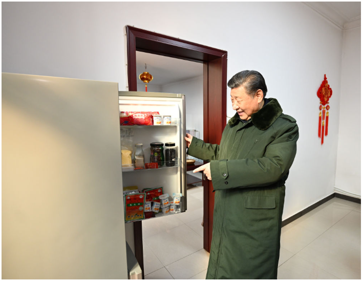 在贫困户家尝土豆、饮瓢水;在受灾户家掀开大缸盖子,察看粮食够不够吃;走进四世同堂之家,打开冰箱,看看都储备了哪些肉和菜……柴米油盐、三餐四季,习近平总书记挂在心头。