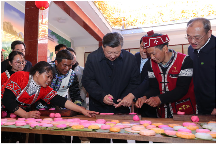 2020年1月19日,习近平总书记在云南腾冲市清水乡三家村中寨司莫拉佤族村,同村民李发顺一家制作当地节日传统食品大米粑粑。新华社记者 鞠鹏 摄