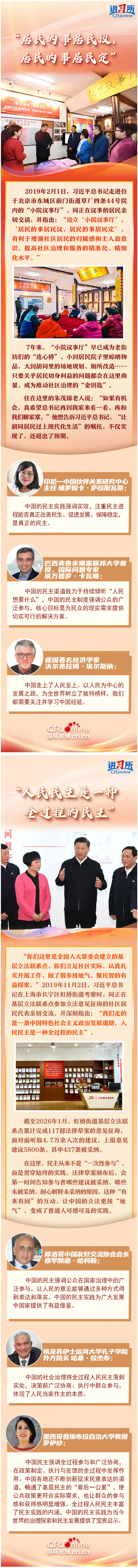 在国际人士眼中,中国的民主渠道致力于持续倾听“人民想要什么”,各地不断创新征集民意表达的渠道,畅通了基层民主的“最后一公里”,为当今世界的治理探索和民主发展提供了宝贵启示。
