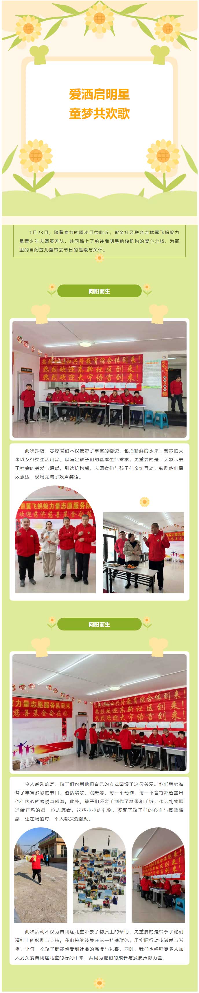 原标题: 紫金社区联合吉林翼飞蚂蚁力量青少年志愿服务队开展“爱洒启明星,童梦共欢歌”活动