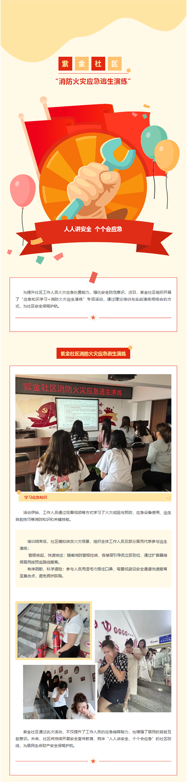 原标题: 紫金社区“安全小课堂”系列活动——以练促防,筑牢消防安全“防火墙”