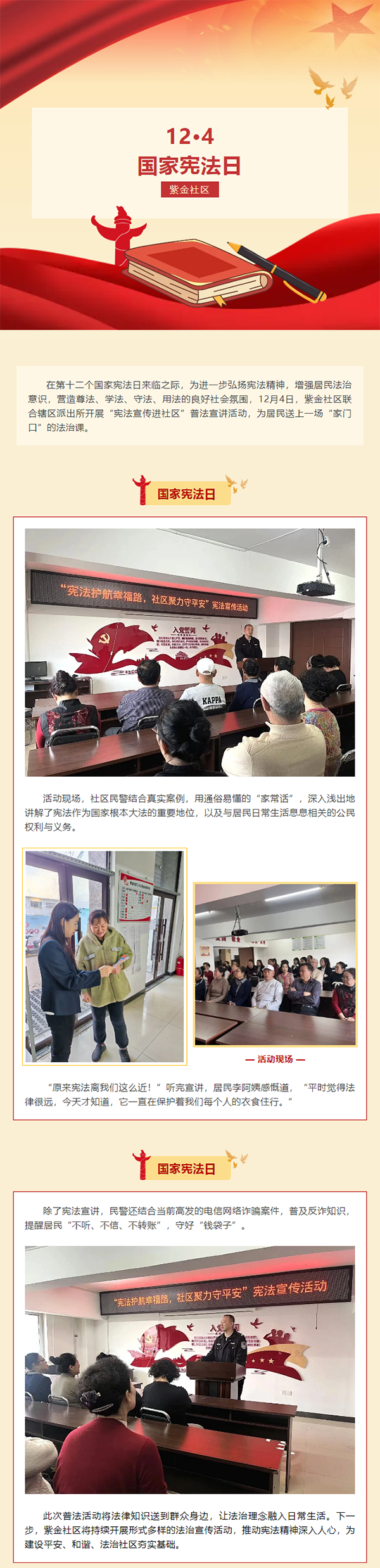 原标题: 宪法护航幸福路·社区聚力守平安——紫金社区开展“国家宪法日”普法宣讲活动